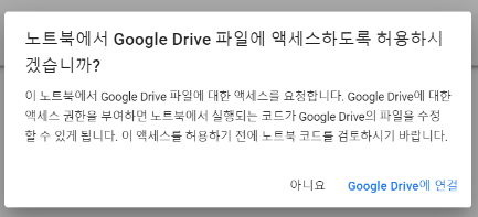 첫번째 플레이 버튼을 누르면 구글 드라이브에 연결 할건지 물어보는 창이 나타나는데