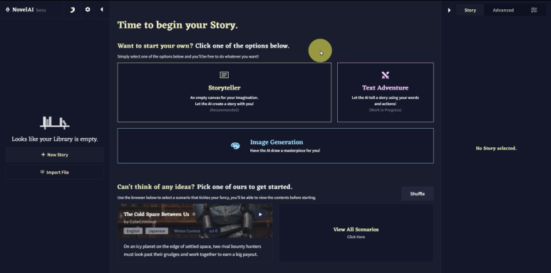 스토리텔러와 텍스트 어드벤처는 기본적으로 소설을 작성하는 AI툴입니다, 오늘은 이부분은 설명하지 않고 그림을 그려주는 기능인 이매지 제너레이션만 보여드리도록 하겠습니다.
