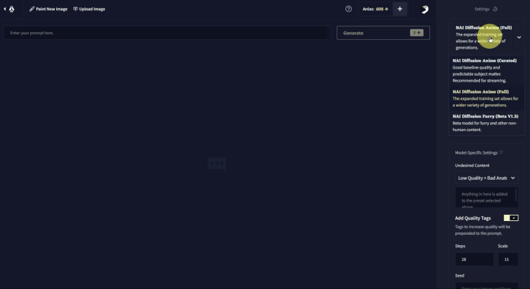 먼저 그림의 기본 베이스가 되는 설정 값인데요. Curated는 조금 더 내가 원하는 방향으로 특화된 그림을 그려준다고 생각하시면 되고, Full은 일반적인 방향이다라고 보시면 될 것 같습니다. 매니악한 것을 원하시면 Curated, 일반적인 성향을 원하시면 Full을 선택하시면 됩니다. 그리고 Furry는 약간 사람이 아닌 것으로 그려주는 설정인데 보통 동물로 표현이 많이 됩니다.