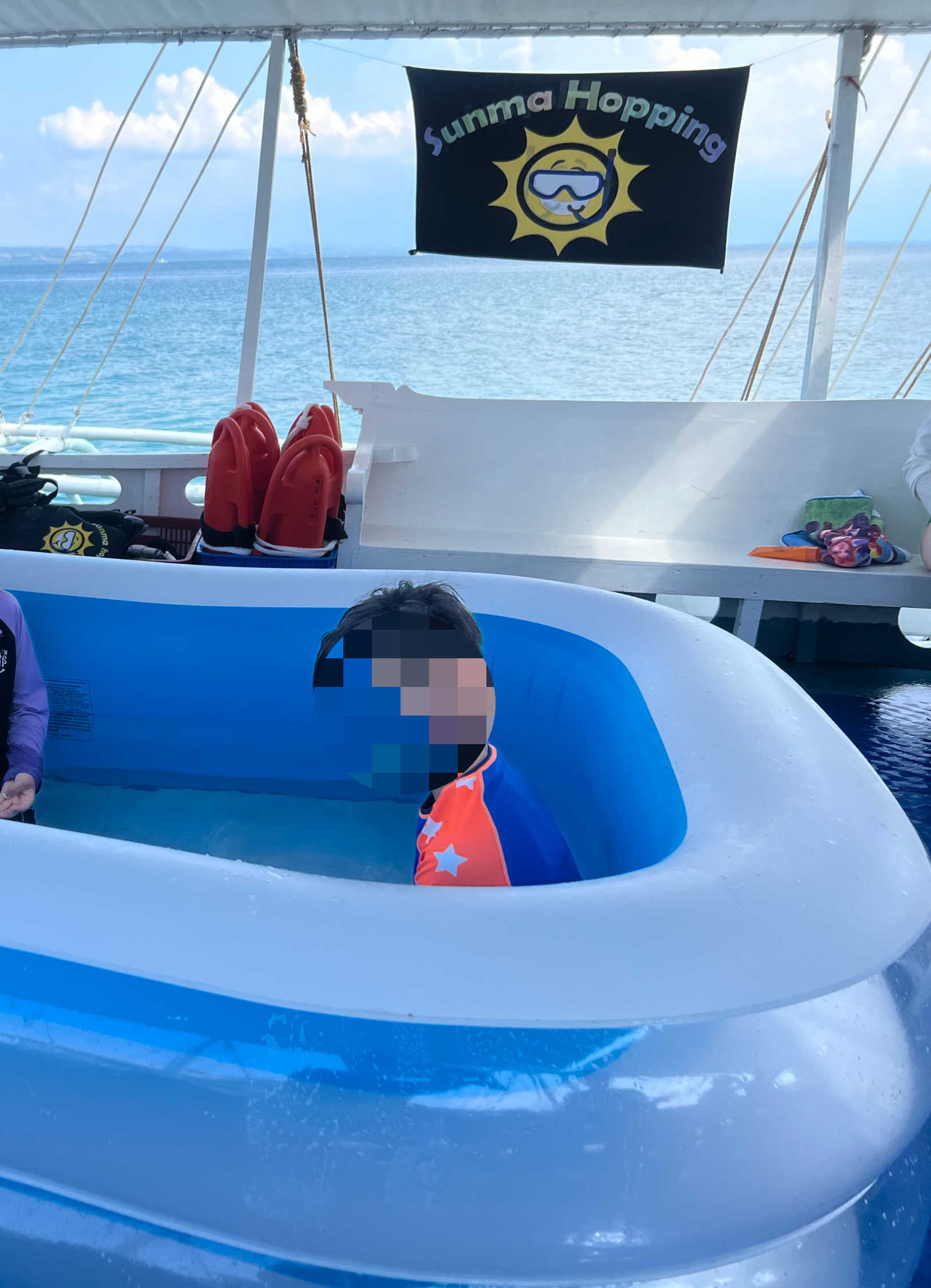 그런데! 썬마호핑은 후기들이 다 너무 시끄럽지 않고 약간은 오히려 차분한(?) 분위기. 그리고 무엇보다 호핑은 한군데만 하고 그전에 판다논 섬이라고 굉장히 아름답고 조용한 섬에서 과일 먹으면서 쉬면서 사진도 많이 찍을 수 있는 곳을 간다는 것이 눈에 띄었다. 그리고 아이들을 위한 작은 풀장을 배에 설치해주어서 아이들있는 집은 특히나 좋다고 하여 바로 선택했다.